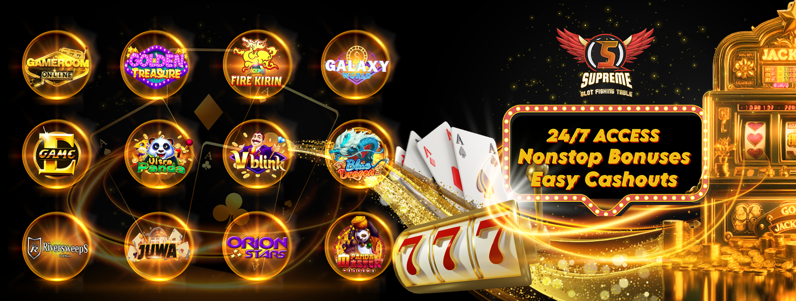 Galaxy world, Fire Kirin, Juwa, Ultra Panda, V Blink, Orion Stars, Gameroom Online, Golden Treasure, Panda Master, Riversweeps, E-game, Blue Dragon, Game Vault, Gone Fishing